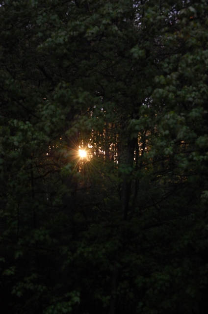 A few days ago it was raw cold and rainy here. It was winter cold again. But toward the end of the day, just before the sun dropped over the horizon, the clouds cleared. The setting sun blazed through the trees for minutes only. Its day was done.