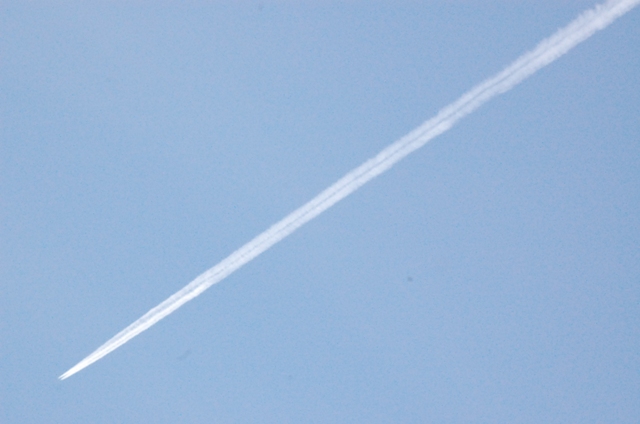 Looking skyward, a jet heads to some corner of the world, plotting its start point and end point on a pixel graph of blue.
