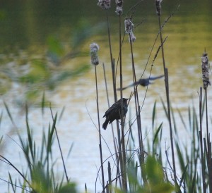 For the past two days, three male red-winged blackbirds have been actively showing off their prowess, by chasing each other – two at a time, through the air over the pond – to win the attention of the females who rarely shows their shades-of-brown selves as they sit quietly, hidden in the reeds.