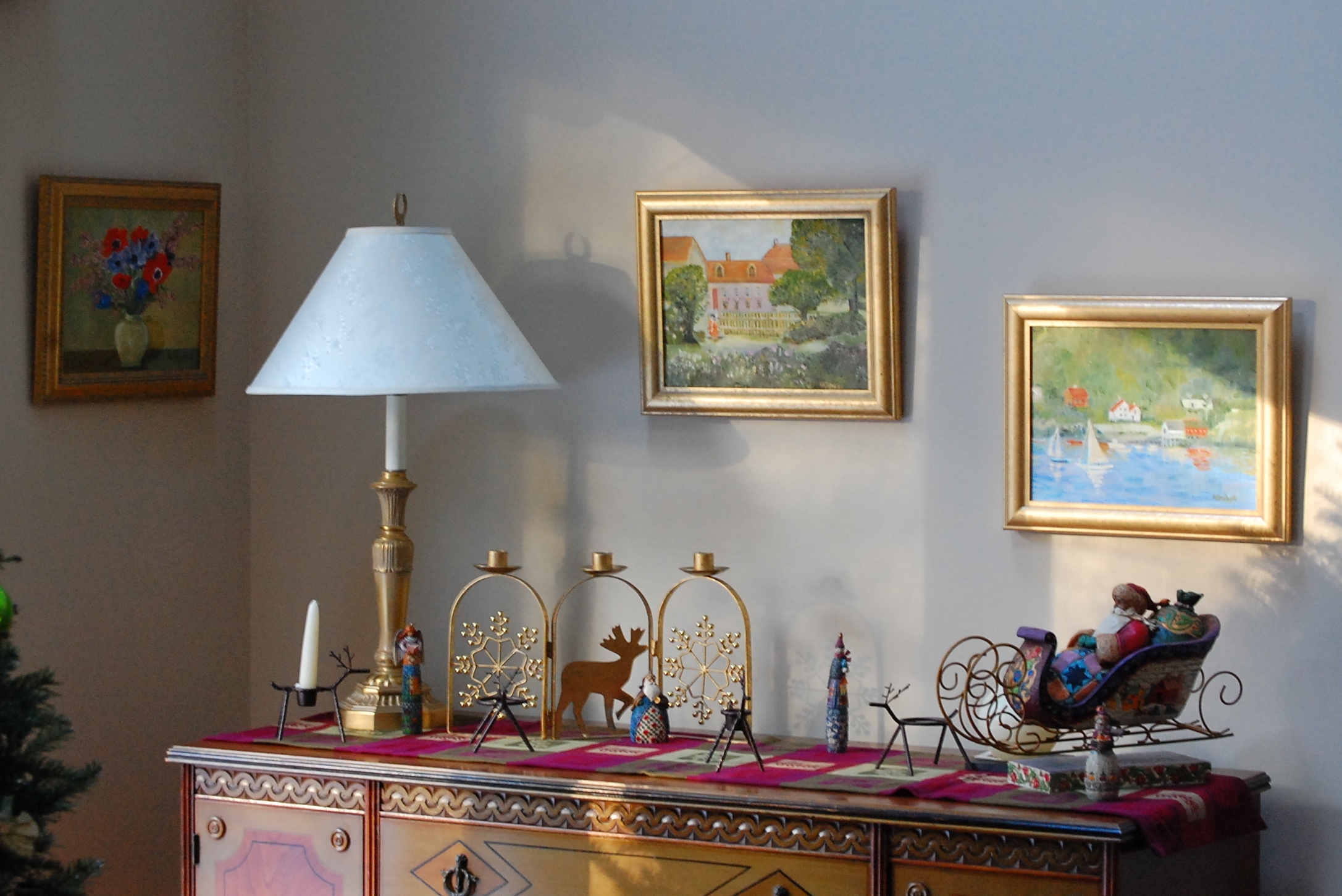 The afternoon sun came in low through a window and illuminated and made shadows on a wall of objects on a chest in a corner. Christmas decorations sat in temporary place while the chest itself and a lamp and three framed paintings held the scene’s unchanging structure. Through the lens lines were aligned and varied positions were tried to use the light before it faded and the shadows were lost. Four good pictures were stored on the disc. The urgency of the moment passed and the sun faded.